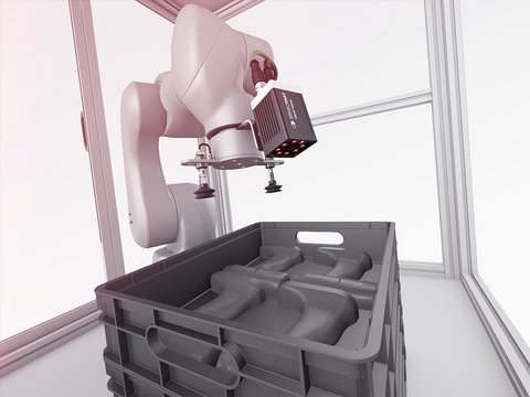 Mit dem VISOR® Robotic werden Bauteile sicher lokalisiert und gegriffen – bei Teilezuführung in einem Universaltray oder über Bunkerzuführung. Bei loser Zuführung steht neben der Erfassung der Position die Prüfung des Greifraums zur Verfügung. Der VISOR® Robotic ermittelt beide Informationen und sendet sie über eine der integrierten standardisierten Schnittstellen an den Roboter-Controller. Abhängig von den Informationen wird nun der Prozess gesteuert.